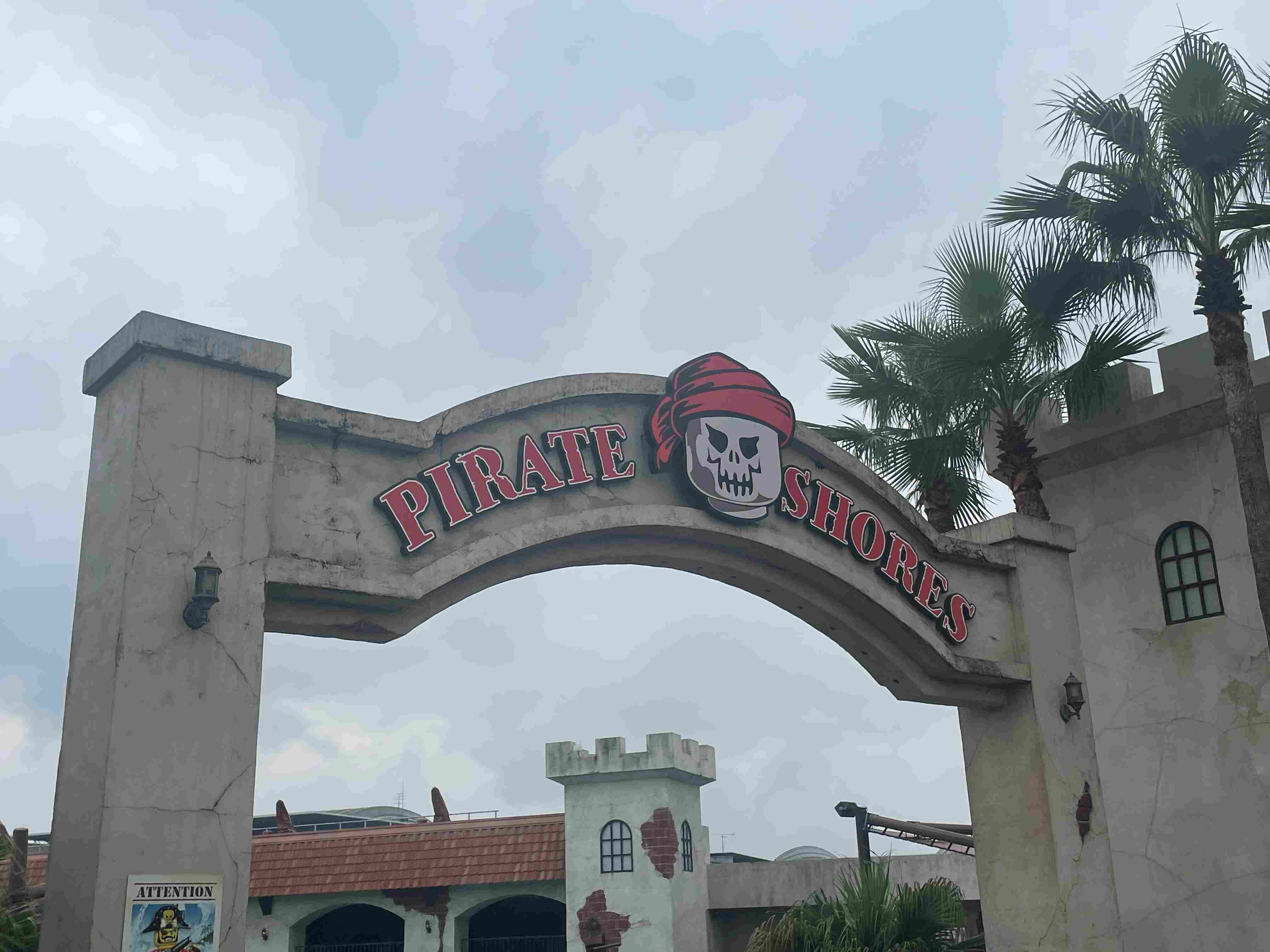 - パイレーツ・ショア・ゾーンへGO!:パーク中央にあるパイレーツ・ショアのショップへ向かい、まずはポンチョを購入します。