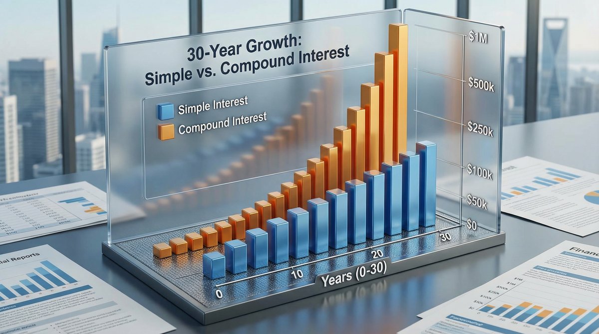 30年後には、同じ元本・同じ利回りでも、複利運用するだけで1,800万円以上もの差がつきます。これが複利の破壊力です。